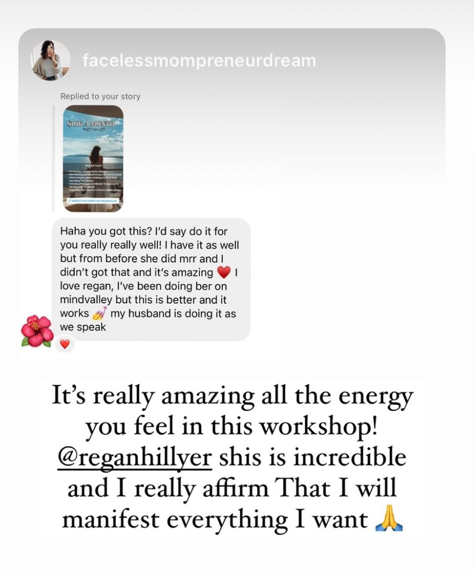 “Learn from the Queen of Manifestation, Regan Hillyer! The first 30 min of this two hour intensive I had a breakthrough that had me literally in tears when I realized the deep routed reason why I have been wanting $10K months. The rest was just pure gold and worth quadruple the investment!"